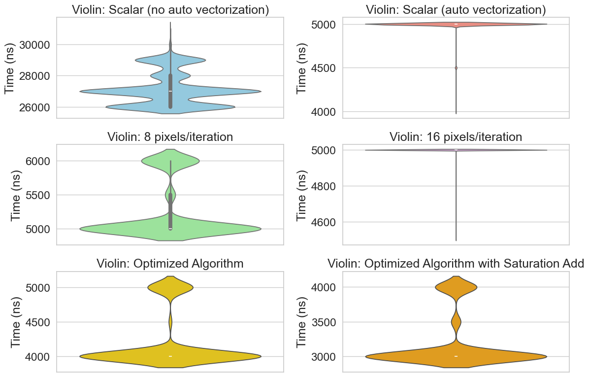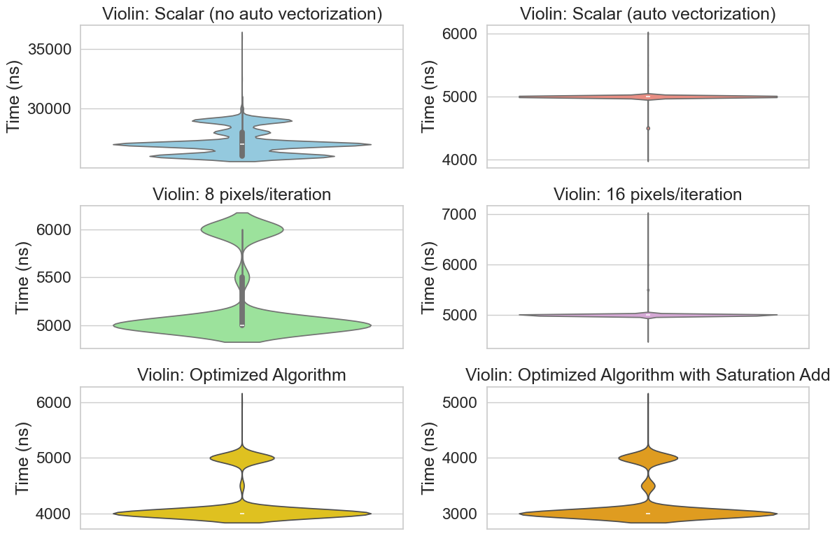 - Load 3x16 values, but separate the color values into 2 registers per channel before doing arithmetic operations. I will refer to this approach as ‘16P’ in the future.